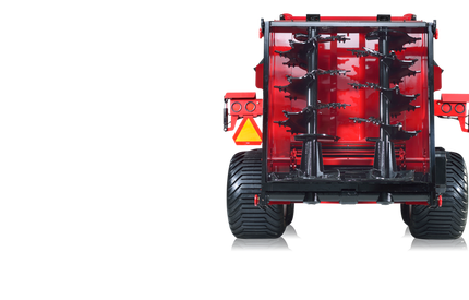 The quick-attach vertical beaters and hydraulic guillotine door, provide a full 40' of consistent spread both from front to back of the load and across the width of the spread. Paired with an optional rear canopy, material can be precisely applied over 50' and from 4-15 tons/acre. The beaters are held by reinforced 2-1/4" bearings which withstand the abuse from large stones and frozen chunks. Six paddles are on the beater base, allow for a fine spread of fiborous and liquid materal.