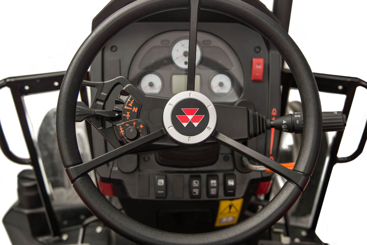 Comfort in a hard-working machine. The 4707 Massey Ferguson tractor comes with 12F X 12R, 2 range, power-shuttle, electro-hydraulic shuttle lever, 58 PTO HP. Loader lift is 3,420 LBS @ pins. Skid steer quick attach bucket and sensitivity adjustment on shuttle make work easier. Electric 4×4 and PTO. Fully synchronized transmission with push button transmission disconnect on shifter lever.